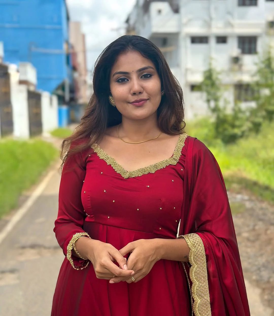 It’s a traditional and elegant Indian ethnic ensemble, featuring a floor-length Anarkali-style dress paired with a matching dupatta. The outfit is crafted in a rich, bright red colour fabric, likely sparkling, lightweight, smooth georgette, which gives it a flowy flair