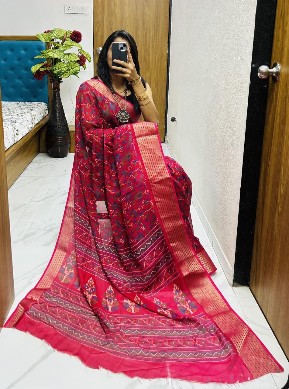 Heavy marsh mellow saree with zari linings and floral print and gold denting zari border all over sarees attached with perfectly matched pallu & blouse peice