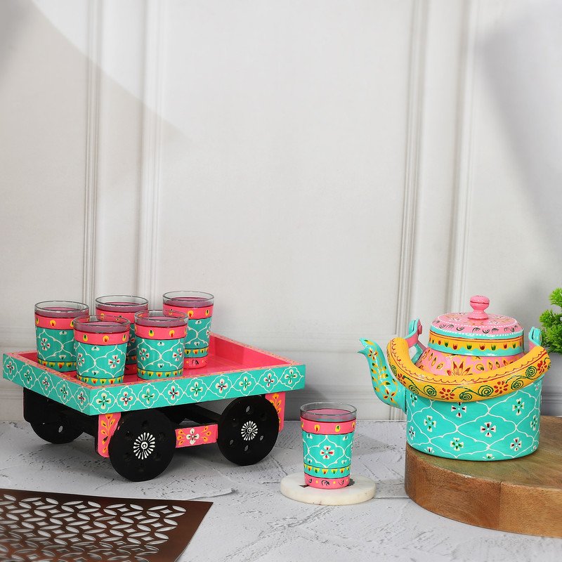 HandPainted Alluminium Tea Kettle with 6 Glasses and Wooden Tray For Home Décor , Tea Party , Serving