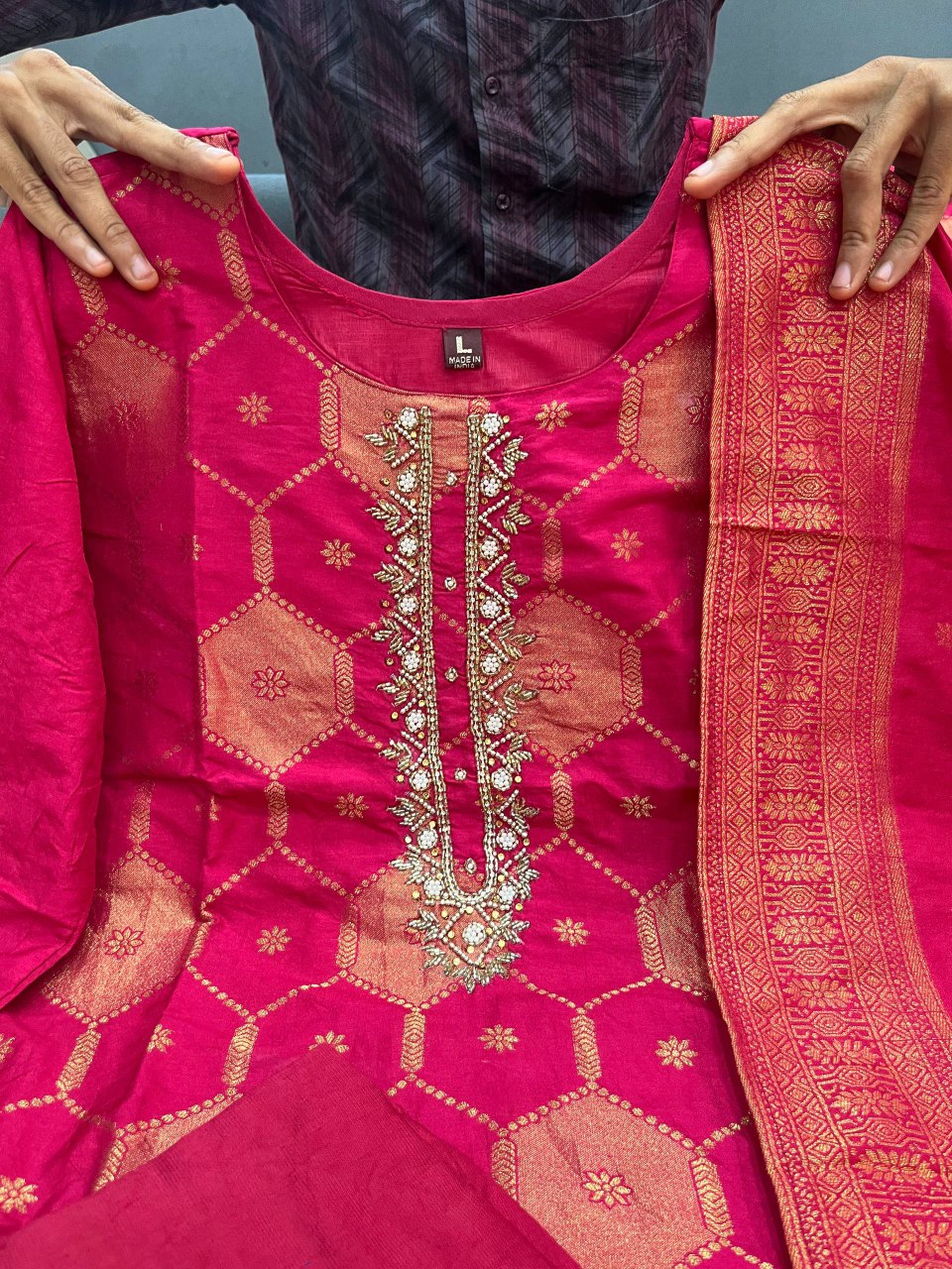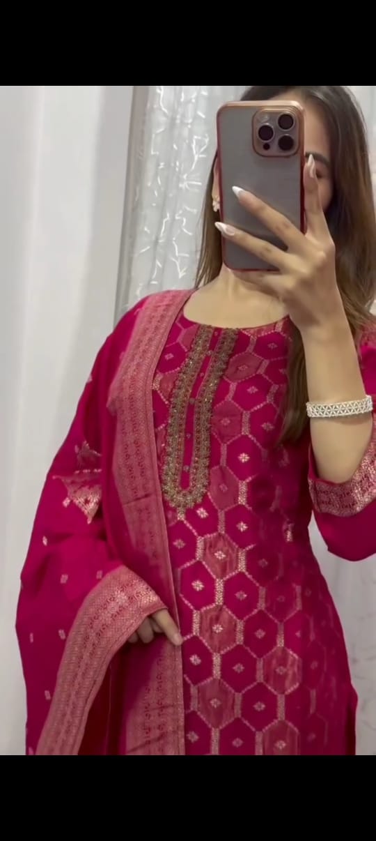 *It is paired with matching pants and a pure weaving zari jacquard dupatta. A must-have for your upcoming gatherings.*