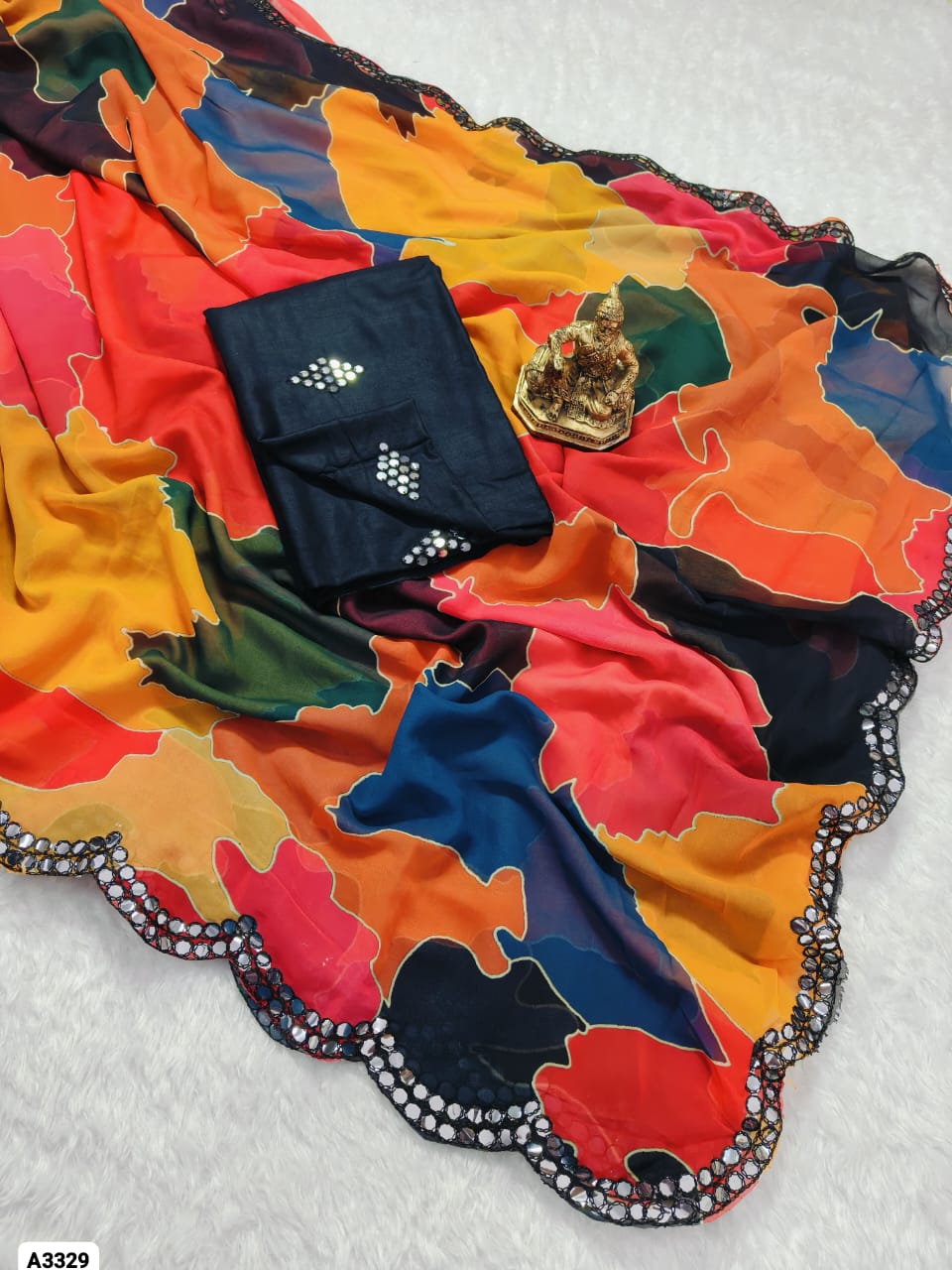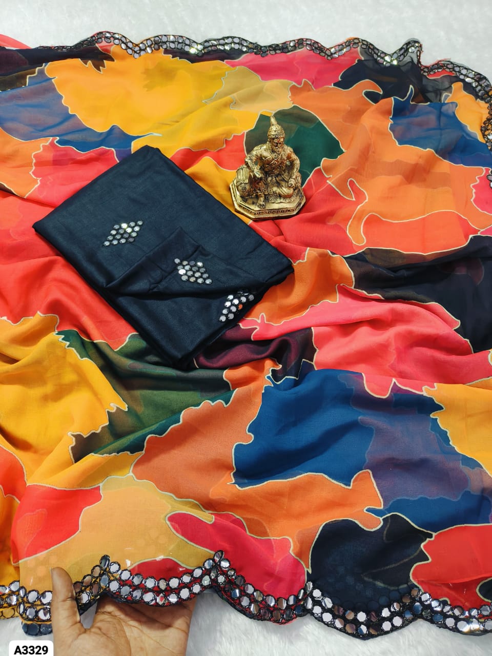Fabric details – Soft & smooth marshmallow georgette with mosaic digital print comes with multi-mirror work, scalloped border
