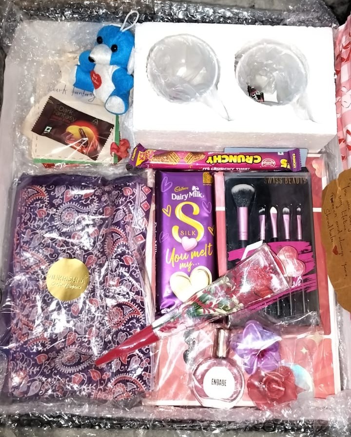 This hamper is a perfect blend of sweetness, utility, and elegance. It feels curated with thoughtfulness — balancing chocolates for indulgence, beauty items for self-care, and stationery for creativity. The decorative presentation makes it visually appealing and emotionally resonant, ideal for birthdays or romantic occasions.