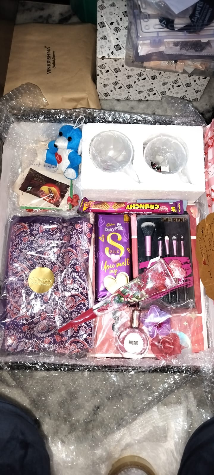 • Beauty Essentials: The Swiss Beauty makeup brush set and Engage perfume elevate the hamper with a touch of glamour and self-care.