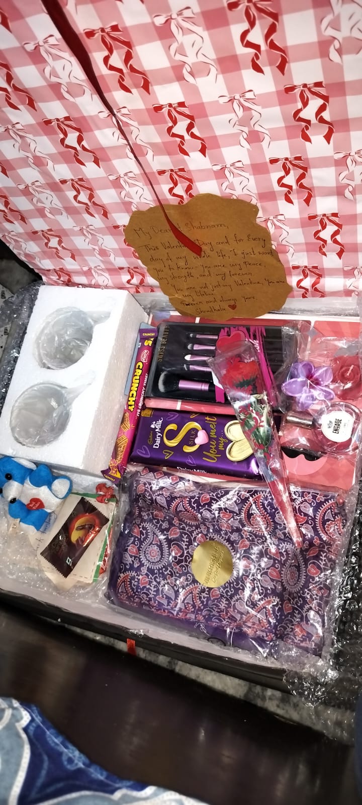 • Decorative Elements: The purple ribbon, red rose, and embellishments tie everything together aesthetically, giving the hamper a festive and premium look.